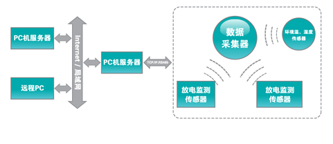 系统包括传感器终端,数据采集器以及配套软件构成。传感器终端包括多种类型的传感器,采集局部放电产生的各个物理信号。数据采集器进行数据的采集,数据融合等操作。配套软件包括服务器软件和终端软件。软件对采集到数据进行分析,处理,归类并建立数据库。数据在终端软件的配合下可以进行数据的远程读取控制等操作。作为智能电网传感器终端的一环,为电力设备保驾护航。
